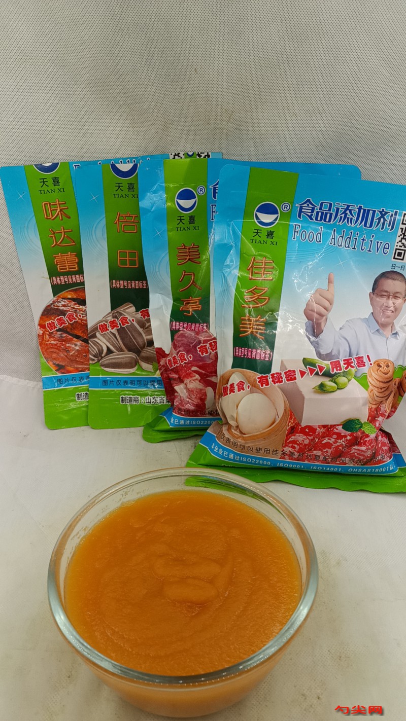 工藝:首先準備500克蘋果,清洗干凈,削皮, 切成小塊,破壁機打成果泥。無油無水的鍋中倒入蘋果肉泥,白糖50克,熬煮熟透,再加入倍田2號1克,這是天喜公司生產的,它屬于復配食品添加劑,加入倍田2號可以使蘋果醬提高甜味,味達蕾702號1克,這是天喜公司生產的,它屬于復配食品添加劑,它可以調節蘋果醬的酸味,2克佳多美A10,這是天喜公司生產的,它屬于復配食品添加劑,它可以使蘋果醬增稠,凝固的作用。1克美久亭A17 (提前使用少許溫水溶解)這是天喜公司生產的,它屬于復配防腐劑,加入美久亭A17克使蘋果醬抗氧化,防腐保存時間長。倒入鍋中, 中小火不停攪拌,熬至濃稠,加入蘋果油香精0.5克,攪拌均勻即可出鍋,晾涼后包裝銷售即可,這樣咱們的蘋果醬就做好了。