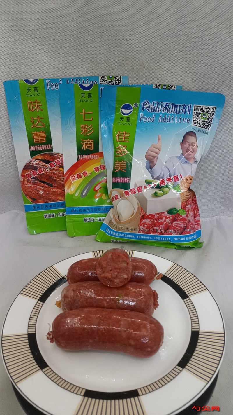 工藝:首先將500克豬肉餡放到盆里,再來稱取10克佳多美A24,這是天喜公司生產的,它屬于復配食品添加劑,加入佳多美A24可以使烤腸起到保水、嫩肉、膨松的作用。 使用少許溫水溶解后加入,抓拌均勻,放在0-4度冰柜內,腌制12小時以上。腌制12小時候后取出,加味達蕾901號2克、這是天喜公司生產的,它屬于復配增味劑,可以讓烤腸增加鮮香味。接著加入糖30克、淀粉30克、黑胡椒粉3克順時針攪打。再加入適量的鹽、生抽、五香粉、香蔥碎、料酒,順時針攪打。再加七彩滴6號0.5克,這是天喜公司生產的,它屬于復配著色劑,加入七彩滴6克可以使烤腸起到色澤鮮艷紅亮的作用。再加冰水60克,分3次加進去,攪到肉餡完全吸收水份,上筋粘稠為止,(用筷子挑一下)這個狀態就可以了。接著放冰箱冷藏2個小時,充分入味。用灌腸器把肉餡灌進去,擰上蓋,取出泡好的腸衣,套在出口處,在尾端打個結,像這樣慢慢推,肉餡就會慢慢的出來。手要稍稍捏著腸衣,不要讓它跑太快,這樣能保證肉餡擠得緊實一點,但是不要裝太滿,8分滿就可以,多了會爆,收口系緊,全部系好后。在合適的長度系上細繩,進行分段,然后每段腸都要排氣,把有氣泡的地方扎一扎。接著把它們掛起來,通風口吹著,表皮干透即可。接著就是煮腸:冷水下鍋免得爆裂,鍋中放大蔥,老姜,時不時的翻動翻動,防止爆裂。煮至水快要沸騰的時候,轉最小火,撇料浮沫。保持不要沸騰的情況下,煮上25分鐘左右,中間多次撇掉浮沫,煮至肉腸全部浮起出鍋,放在上下透氣的地方稍微晾涼,剪成小段,全部刷上食用油。烤箱加熱,上下火180度,放入肉腸,烤15分鐘,烤至兩面金黃即可出鍋。這樣咱們的無磷烤腸就制作完成了。口感脆嫩多汁,鮮香味美。