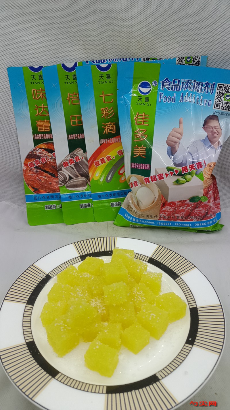 工藝:首先鍋中加入100克水,稱取10克佳多美A04,這是天喜公司生產(chǎn)的,它屬于復(fù)配增稠劑,加入佳多美A04可以起到增稠,凝固,成凍的作用,使用少許溫水溶解倒入鍋中,稱取倍田11號(hào)1克,這是天喜公司生產(chǎn)的,它屬于復(fù)配甜味劑,加入倍田11號(hào),可以讓軟糖增加甜度。加入麥芽糖漿400克,中火煮開,煮至沸騰,再來準(zhǔn)備50克淀粉加入100克水?dāng)嚢枞芙猓谷脲佒校叺惯厰嚢瑁行』鸢局疲尤腴僮佑拖憔?克,熬制粘稠,改小火,最后熬至粘稠抱團(tuán)就可以了。然后把熬制好的軟糖坯子放在油紙上摁平,然后再用油紙折疊,蓋上,放入冰箱冷藏3個(gè)小時(shí),然后再切成方塊,把切好的方塊撒上一層白沙糖粉, 翻拌均勻。包裝即可銷售。這樣咱們的水果軟糖就做好。