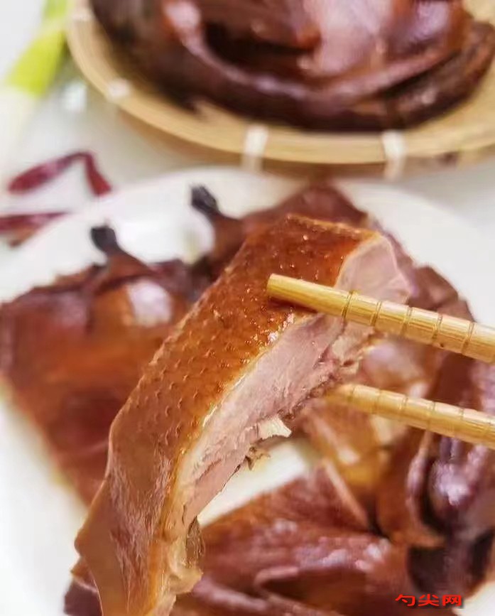鹵鴨工藝:1、把烤好的板鴨半品放入制作好的鹵水里,如果浮起可用合適的盤押在上面。2、大滾3-5分鐘(天冷或鴨多的時間長點),熄火浸鹵2-8小時不等(視頻用了2小時,味道已夠)。3、鹵好的鴨出鍋吊干水份,這里鴨身收縮,如視頻重新用筷子撐平。4、把撐好的鴨,掛起來放在通風口處吊一晚或干水就可以吃了。