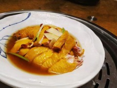 工藝:1.原料處理。選用1kg左右的母雞,富磷聯B8克,采取專用脫毛機,現宰現殺,將皮毛去凈稍涼后進行開膛,先從雞體的第2關節處切斷翅膀、雞腳,然后取出全部內臟,使用富磷聯B溶液浸泡8小時,再放入清水中洗凈晾干。2.制坯抹漿。將取膛洗凈的雞體用一塊長木棒或竹片,從翼下開口處插入胸腔,將雞體的胸背撐起,放入沸水鍋內,同時讓雞體展開,然后把雞從沸水中取出輕輕抹干水,用少許稀釋后的糖液,從上而下將雞體抹勻,再用先前切成斜口的細竹子一根,插入雞雙腿吹氣后送人烤房,將雞烤到表皮起皺紋時取出。3.控溫淋油。用5~6cm長的竹簽將雞的兩翅掛起。備一口鍋將茶油(或菜油)放人鍋里燒沸,一手拿鐵鉤將雞提起,另一手用小鐵勺將熱油反復往雞體身上淋油,按順序是先淋雞身、雞腿,后淋雞背、雞頭,雞體肉厚的地方可反復淋油,油溫控制在90℃左右,溫度過高容易使雞皮起殼脫皮而肉不熟。每只雞大約淋到9min左右,雞身呈金黃色,帶光亮,有皺紋,說明雞已經淋好。取下竹片和木片后還要檢查一下,如果雞體流渾水,說明雞沒有熟透,還必須繼續淋油,如雞肚內流出的是清水,即為成品。