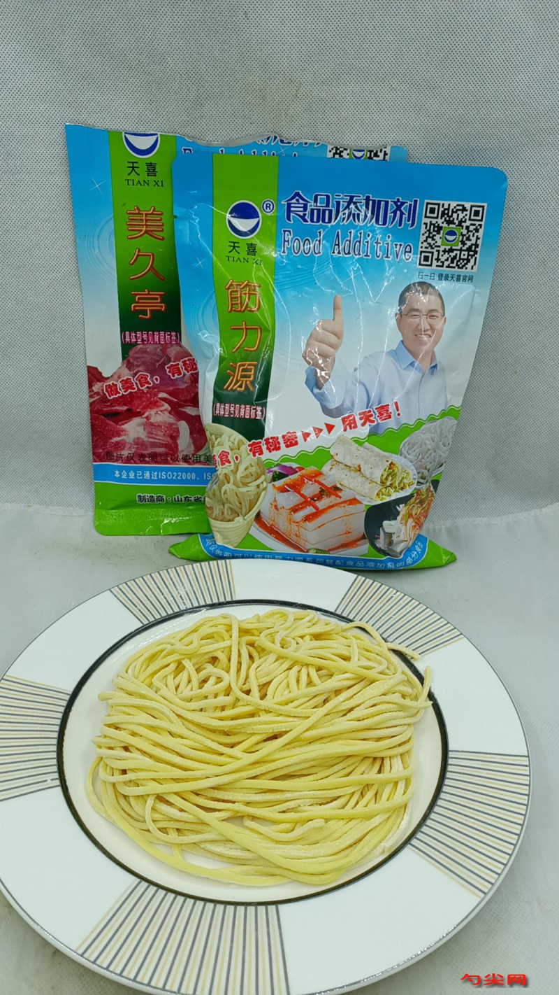 工藝:首先稱取玉米面380克、加入160克開水進行燙面,再稱取黃豆面20克、高筋小麥粉100克混合均勻,再加入筋力源W型2.5克,筋力源W是天喜公司生產的,屬于復配食品添加劑,加入面粉中干拌均勻,加入筋力源W可以使雜糧干面條口感筋道有嚼勁、耐煮不斷條、不易渾湯。燙好的玉米面晾成溫的,如想延長雜糧面條保鮮時間,還可以添加天喜公司生產的美久亭W2克,使用數倍涼開水溶解后加入盆中,將混合好的面粉中加入,和成絮狀面團,將和好的絮狀面團靜止醒發20-50分鐘,然后放入壓面機即可軋面(一般軋面5-8遍,次數越多越筋道)。將軋好的玉米雜糧鮮面條采用酒精噴霧消毒,然后密封包裝,紫外線殺菌,再放冷柜低溫10-15℃保存。