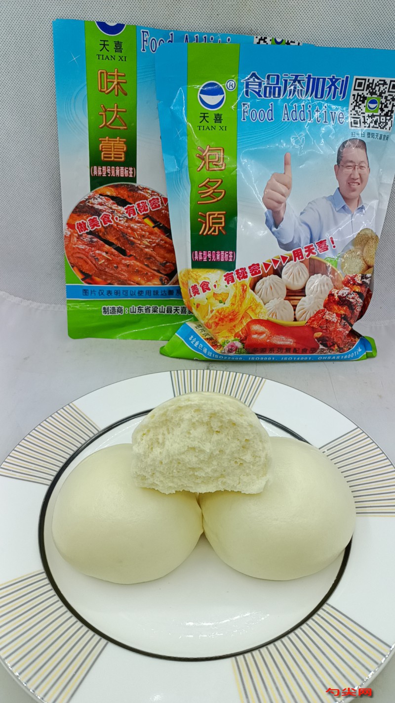 工藝:首先稱取中筋面粉500克、泡多源Q20克,這是梁山天喜生產的,它屬于復配食品添加劑,加入泡多源Q可以使做出來的速凍饅頭膨松個大飽滿,口感松軟,冷凍不裂口。將泡多源Q倒入面粉中,與面粉干拌均勻。再來稱取溫水275克,水中加入酵母5克,鹽2克,白糖20克,豬油3克,攪拌均勻,慢慢倒入面粉中,攪成面絮,活成面團,蓋上保鮮膜,放入醒發箱濕度75度,溫度38度,醒發30分鐘。將醒發好的面團取出,案板上撒少許面粉,將面團揉壓排氣,搟成長條,揪成劑子,團成圓形。全部做好后,再次醒發25分鐘,醒發好后,擺入盤子中,放入速凍庫(柜)-38度速凍!速凍40-50分鐘后移入-18度冷藏庫(柜),正常冷藏保存。將速凍好的饅頭取出,大家看,這是我們速凍好的饅頭。冷凍不裂口,接下來常溫解凍20分鐘。然后開始上鍋蒸,溫水入鍋,將饅頭擺放蒸籠中,大火蒸制20分鐘,20分鐘后關火,停3分鐘,香噴噴的饅頭就可以出鍋了。這樣咱們的速凍饅頭就做好了