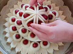 工藝:將中筋面粉與泡多源A干拌均勻。將溫水、酵母、白糖和豬油攪拌溶解后,加入面粉中。攪成絮狀后,揉成硬點的面團,多揉一會,把面團揉勻、揉透。將揉好的面團放入醒發箱,設置溫度38度,濕度75%,醒發30分鐘。醒發好的面團放到案板上,揉面排氣,搓成長條。切下一小塊面團,搟成薄片,約3毫米厚度。用模具壓出小圓餅,或者用刀切成適當大小的形狀。取一張面片從中間對半切開,用梳子在正反面的一半位置壓出紋路,中間放一顆紅棗,再把兩個角捏緊,形成小花瓣。按照棗花糕的層次結構,依次擺放面片和花瓣。中間層鋪上紅棗,上面再蓋上一張面片。重復此步驟,直至達到所需層數和高度。最頂部可以放上用面片制作的花朵和紅棗進行點綴。在蒸鍋中加入足夠的水,大火燒開后,將整型好的花糕放入蒸屜中。保持一定間距,以防粘連。蓋上鍋蓋,用中火蒸制一定時間(根據花糕大小和厚度調整)。蒸制時間結束后,關火并等待片刻,讓花糕在蒸鍋中自然降溫。用防燙手套取出蒸好的紅棗花糕,擺放在盤中即可享用。