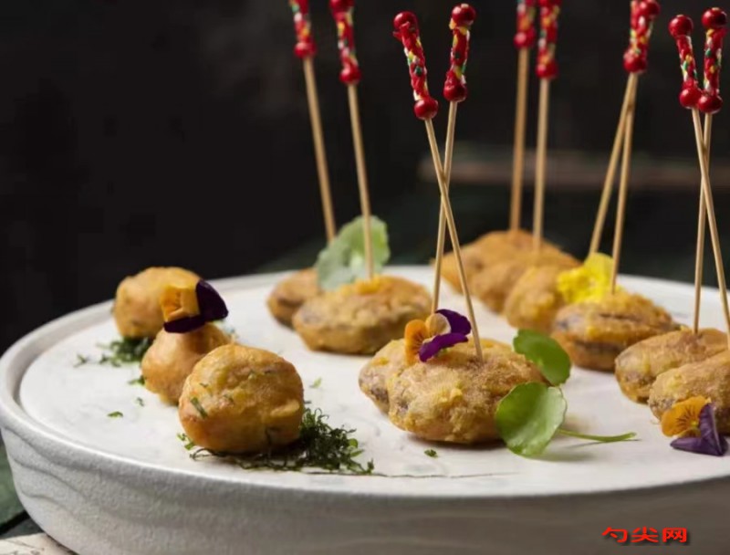 配方:12頭鮑魚12只、荔浦芋頭100克、菜松100克、咸蛋黃30克、面欣酥B 2克、大蔥10克、大蒜10克、芹菜5克、蒜苗5克、水果竹簽12根。調料:十三香5克、白糖10克、東古醬油10毫升、美極鮮醬油5毫升、生抽3毫升、豐谷白酒10毫升、豬油20克、味達蕾901號2克,雞精、色拉油各適量