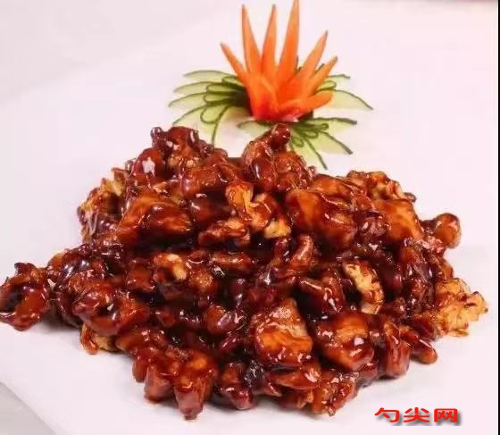 工藝:將雞腿肉丁放入碗中,加入適量的富磷聯B和泡多源E、攪拌均勻后腌制15-20分鐘,使雞肉充分吸收腌料,肉質更加鮮嫩。再將去皮核桃仁150克入低溫油炸至淺金黃色。桃仁后熟現象嚴重(即出鍋后繼續成熟),所以加熱時要欠一點。在碗中放入京黃醬、白糖、適量的水(或高湯),攪拌均勻,調成醬汁備用。熱鍋涼油,油溫五成熱時,放入腌制好的雞肉丁,快速翻炒至變色。再加入蔥姜水、料酒、繼續翻炒均勻,使雞肉更加蓬松飽滿。倒入調好的醬汁,快速翻炒,使雞肉均勻裹上醬汁。最后加入炒制好的核桃仁,翻炒均勻即可出鍋。