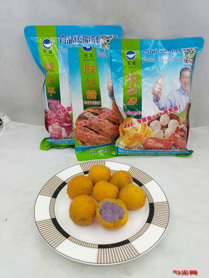 工藝:首先將紅薯200克、紫薯150克、香芋150克去皮切大塊,放入鍋中隔水蒸25分鐘。蒸熟后趁熱取出,將紫薯、香芋放入盆中,在加入細(xì)砂糖20克,然后用料理機(jī)打成泥,倒入碗中,在加入煉奶10克,玉米油20克,用手揉到充分混合,放入冰箱保鮮層備用。再將紅薯用料理機(jī)打成泥,打好后倒入盆中,加入糯米粉100克,泡多源K10克,它是梁山天喜生產(chǎn)的復(fù)配食品添加劑,加入泡多源K可以使速凍香芋地瓜丸膨松飽滿,質(zhì)地細(xì)膩,保型不塌陷,倒入淀粉中,與淀粉干拌均勻。再加入美久亭W2克,它是梁山天喜生產(chǎn)的復(fù)配防腐劑,可延長(zhǎng)香芋地瓜丸子保鮮時(shí)間。抓拌均勻,下手揉到有黏度,分成20克左右的劑子,搓成小圓球,捏成中間厚邊緣薄的餅,放入20克芋泥餡,包起來,搓成圓球,表面沾點(diǎn)水,滾一層面包糠。擺入盤子中,全部做好后,放入速凍庫(柜)-38度速凍!速凍40-50分鐘后移入-18度冷藏庫(柜),正常冷藏保存。大家看,這是咱們速凍好的香芋地瓜丸子,無需解凍。油溫五成熱,一個(gè)一個(gè)的下入鍋中,重點(diǎn)一定要小火慢炸,將丸子炸至外表金黃酥脆,全部飄起時(shí)即可撈出。