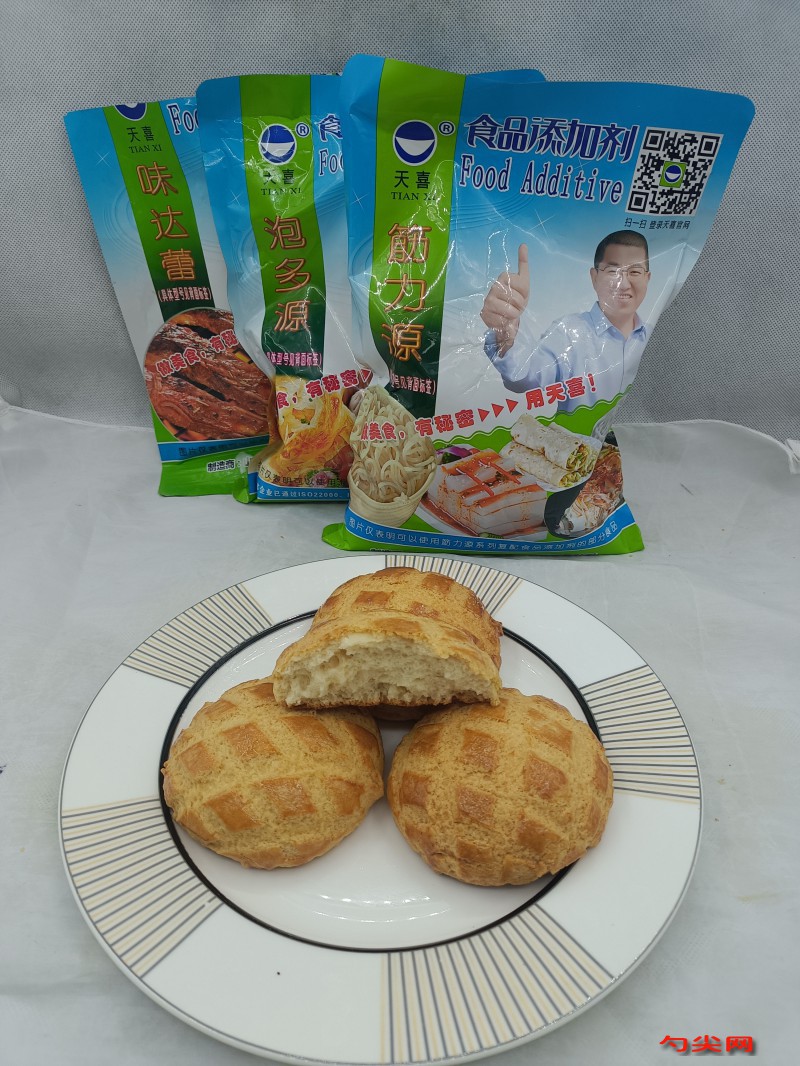 工藝:首先來制作酥皮,稱取60克黃油,60克白砂糖, 抓拌均勻 ,再稱取75克低筋面粉,面欣酥E3克,倒入面粉中干拌均勻,這是梁山天喜生產的面欣酥E,它屬于復配食品添加劑,加入面欣酥E可以使酥皮膨松飽滿、口感酥脆、入口即化,再次抓拌均勻。平均分成12等份,團圓,將劑子放在吸油紙上面,再蓋上一層吸油紙,使用平面工具按壓一下,厚度比餃子皮厚一點就可以,平鋪在盤子中放入冰箱冷凍成型。先稱取中筋面粉500克,加入泡多源T10克,這是梁山天喜生產的泡多源T,它屬于復配食品添加劑,加入泡多源T可以使速凍菠蘿包膨松飽滿,筋力源A08號1克,這是梁山天喜生產的復配食品添加劑,加入 筋力源A08號可以防止速凍菠蘿包干縮、裂口, 一起倒入面粉中與面粉干拌均勻,加入酵母5克使用少許溫水進行溶解,加入面粉中,攪拌均勻,再稱取溫開水250克,水中加入白糖100克,雞蛋一個,攪拌溶解均勻,倒入混合好的面粉,開啟和面機,攪成面絮,活成光滑的面團,再加入鹽3克,黃油 50克,繼續打至拉出薄膜即可。先不用醒面,直接搓成長條,分成60克左右的面劑,團圓后放入醒發箱,將醒發箱調至濕度75度,室溫38度,醒發40分鐘。 醒好的面劑表面噴水,上面蓋上一個酥皮,表面刷上一層蛋黃液,使用工具劃出紋路。全部做好后,即可放入速凍庫(柜)-38度速凍!速凍40-50分鐘后移入-18度冷藏庫(柜),正常冷藏保存。 大家看,這是我們速凍好的菠蘿包,常溫完全解凍,烤箱提前預熱,放入烤盤,上下火160度,烤20分鐘,烤至顏色金黃即可出爐,