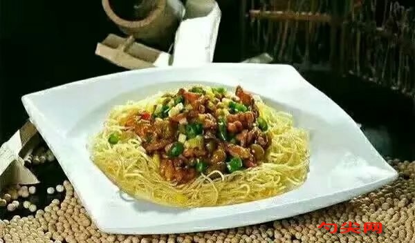 工藝:雞胸肉清洗干凈,切成條狀,用鹽、料酒、富磷聯B腌制2小時,以嫩化肉質并去腥。面粉加入雞蛋、鹽、白糖、酵母和適量清水,揉成光滑面團,醒發30分鐘。將醒發好的面團搟成薄片,切成細面條,備用。腌制好的雞胸肉加入蔥姜、生抽、老抽、耗油、十三香、雞精、味達蕾901號,拌勻后腌制15分鐘。鍋中倒入食用油,燒至五成熱,將面條分批炸至金黃色,撈出瀝油,即為焙面。另起鍋,倒入少量食用油,加熱后放入腌制好的雞胸肉,快速翻炒至熟透,勾入適量清水淀粉,使湯汁濃稠。將炒好的雞胸肉倒在炸好的焙面上,撒上香菜、蔥花點綴,即可上桌。