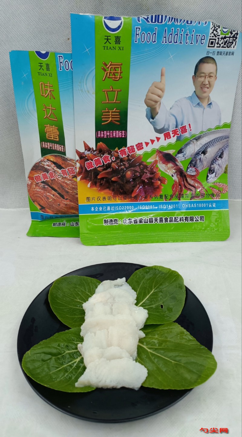配方:魚肉500克、海立美F2.5克、味達蕾902號2克、冰水500克。工藝:首先把清理干凈的魚肉500克,斜刀切成薄片。稱取海立美F2.5克,這是這是天喜公司生產的海立美F,它屬于復配食品添加劑,加入海立美F可使肉質細嫩,膨松彈性好, 保水出品率高!使用溫水溶解后倒入盆中,再加味達蕾902號2克,它是梁山天喜生產的復配增味劑,可以起到增加鮮味,去腥味的作用,加入冰水500克,腌制3小時,備用。將腌制好的魚片擺入盤子中,即可放入速凍庫(柜)-38度速凍!速凍40-50分鐘后移入-18度冷藏庫(柜),正常冷藏保存。 大家看,這是我們速凍好的黑魚片,鍋中燒水,燒開水后,把魚片逐個放入開水中燙熟,即可撈出。涮火鍋、烹調都可以。
