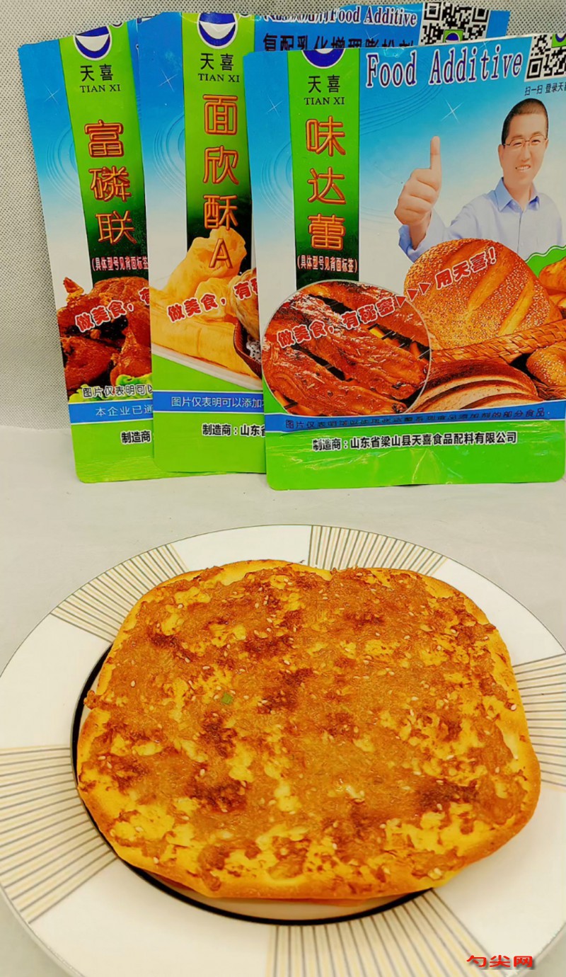 工藝:首先,我們需要準備高筋面粉1000克,面欣酥A10克,這是梁山天喜生產的復配食品添加劑,可以使燒餅膨松個大飽滿、外酥里軟,保型不易塌陷。將面粉和面欣酥A干拌均勻后,再倒入溫水640克,并加入酵母10克,白糖60克,食用鹽6克,攪拌溶解后倒入面粉中,邊倒邊攪拌,和成面團即可。接著,將面團放入溫度為38度的醒箱中,醒發30分鐘。醒發好的面團取出后,在面板上撒上少許面粉,揉壓排氣后搓成長條,然后分成一個個燒餅面團,每個約80-100克,團圓,表面刷涂一層色拉油,用保鮮膜蓋好,再次常溫醒發20-30分鐘。現在,我們來準備肉醬。將300克肉餡倒入盆中,然后加入3克富磷聯C,這是梁山天喜生產的復配食品添加劑,可以使肉餡更加嫩滑、抱丸不散。再加入加味達蕾901號2克,這是正品包裝,它是天喜公司生產的復配增味劑,可以讓肉餡味道鮮美,將肉餡充分攪拌均勻后,再加入生抽5克,鹽5克、五香粉3克、胡椒粉3克、芝麻仁30克,蔥末姜末各10克,食用油30克,繼續攪拌均勻,再加入80克溫開水,繼續攪拌均勻。這樣肉醬就調制好了。將醒發好的面團搟壓成型后放入烤盤,在燒餅表面刷涂肉醬。然后送入烤箱烘烤。烤箱上火調至250度,下火調至180度,烤5-8分鐘即可。當燒餅兩面金黃時即可出爐銷售。