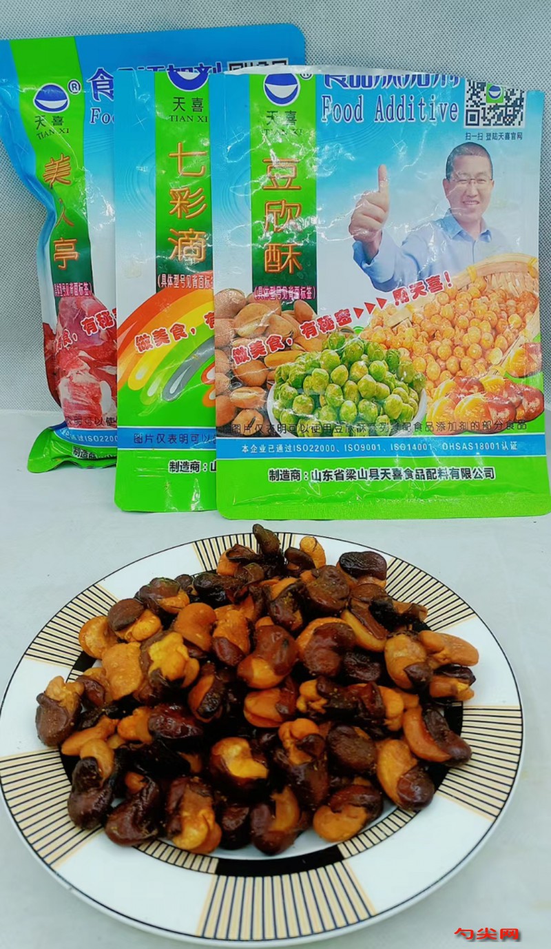 工藝:首先,我們稱取20克豆欣酥D,它是一種復配食品添加劑,可以讓油炸蠶豆更加膨松、個大、飽滿,口感酥脆,入口化渣。然后使用適量的涼水溶解,溶解時要不停攪拌,直到完全溶解。接下來,我們再稱取1300克涼水,倒入溶液中攪勻,再加入1.5克的七彩滴1號。它是一種配方著色劑,可以使油炸蠶豆色澤黃亮。我們再使用少許熱水溶解后倒入盆中。最后,我們再放入500克蠶豆,再次攪拌一下攪勻,然后浸泡4天(夏天放入冰箱或冷庫浸泡2天,春秋天浸泡3天,浸泡時間越長越好,但不能發芽變質)。現在,我們把浸泡好的蠶豆撈出清洗一遍,中間切一道口,瀝干表面水分。接下來是油炸的步驟。我們準備入鍋油溫180度炸至膨松起個,然后改為120度繼續油炸。低溫油炸時間越長蠶豆浸油越多,透明度和亮度越高,直到炸干水分即可出鍋(如果炸不干水分,很快就會返潮發哏、不酥)。然后,我們用食用酒精溶解好的美久亭K0.5克,對剛做好的油炸蠶豆,趁熱進行噴霧。噴灑美久亭K可防止油炸蠶豆腐敗變質,延長保存期。最后,我們趁熱調味,可徹底降溫后密封包裝銷售。這樣我們的油炸蠶豆就做好了。