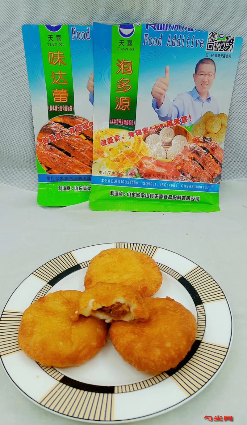 工藝:首先,我們需要稱取300克的糯米粉,加入6克泡多源K型,這是一種由梁山天喜生產的復配食品添加劑,能夠使糯米炸糕更加膨松飽滿、質地細嫩,并且有保型的作用。倒入糯米粉中干拌均勻,再稱取溫水250克,水中加入酵母3克,白糖20克,食用油10克,攪拌溶解后,倒入糯米粉中,攪拌均勻,揉成面團。蓋上保鮮膜,常溫醒發1個小時。再來準備豆沙餡,豆沙餡加入少許面粉拌勻,然后分成均等的劑子備用。將醒發好的糯米面團取出,揉壓排氣,然后分成每個約50克的劑子。取一個劑子放在手心,用手掌按壓后包入適量的豆沙餡。使用虎口收攏法將空氣排出,收緊,揪去多余的部分,封好口后,兩手均勻地用力按壓,這樣炸糕的生胚就做好了。案板上抹油,放上油炸糕,蓋上保鮮膜,再次醒發10分鐘。最后一步是油炸。鍋中油溫提前160度預熱。將生胚下入鍋中,定型后再輕輕翻面,炸至兩面金黃即可出鍋銷售