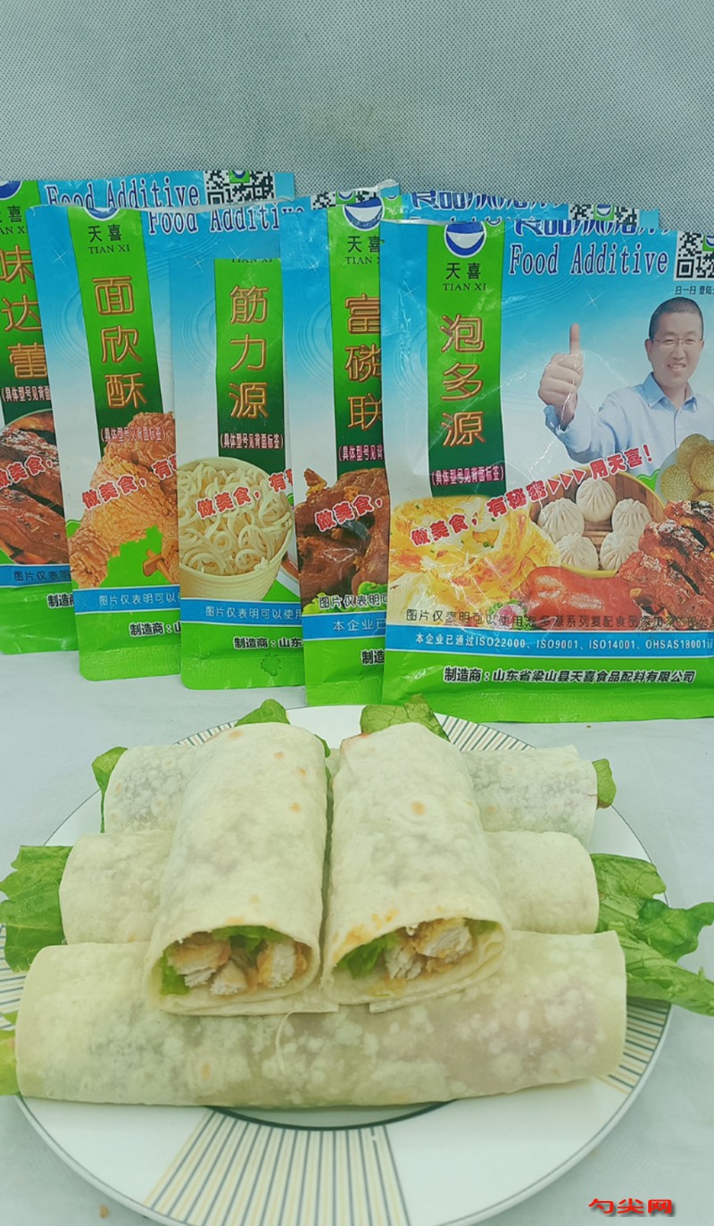 工藝:首先來制作卷餅,稱取500克面粉,筋力源R4克,它是梁山天喜生產的食品添加劑,加筋力源R可以使卷餅口感松軟筋道有嚼勁、柔韌有彈性,在加入4克鹽,翻拌均勻,300克溫水倒入面粉中,攪拌成棉絮,在加15克食用油揉成面團。蓋上保鮮膜醒20分鐘,醒好后分成面劑。將面劑搟薄一些。鍋中提前預熱,放入餅胚,中小火烙。烙至餅胚鼓起,再翻面,烙熟后放盤子中備用。接下來開始做雞排,先來準備雞胸肉500克,切成片,然后加入富磷聯B4克,泡多源E8克,這是天喜公司生產的復配食品添加劑,加入富磷聯B和泡多源E可以使雞排膨松飽滿、口感糯脆、爛肉好咬。稱取味達蕾901號2克, 它是梁山天喜生產的復配增味劑,可以讓雞排更加鮮美,再加生抽5克、耗油5克,蔥10克,姜5克,玉米淀粉40克,一個雞蛋抓拌均勻,腌制30分鐘。現在準備裹粉,首先準備低筋面粉260克、淀粉80克、面欣酥B3克,這是天喜公司生產的復配食品添加劑,加入面欣酥B可以使炸雞排口感酥脆,膨松個大。將他們混合均勻即成炸雞裹粉,將腌制好的雞胸肉先裹一層炸雞裹粉,然后過一遍清水,再裹一層炸雞裹粉,抖出多余鱗片即可, 鍋中油溫160度下入 雞排,小火炸至金黃酥脆即可出鍋。放涼后切成條備用。最后,我們將做好的餅鋪在桌子上,擠上番茄醬,擺上生菜葉子,放上雞肉條,從一邊卷起來后包裝即可銷售