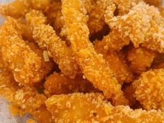 工藝:將切好的雞柳放入盆中,加入調味品和泡多源E,抓拌均勻進行腌制,腌制入味即可。往盆中加入低筋面粉和面欣酥B,加入適量的食用鹽和清水,調制成面糊。把腌制好的雞柳倒入面糊中,確保每根雞柳都均勻掛上面糊。鍋中倒入足夠的食用油,油熱后下入掛好糊的雞柳進行油炸。小火慢炸至雞柳微黃撈出,然后加熱油鍋,進行二次復炸,大火炸至金黃撈出。