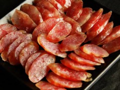 工藝:1、選料及整理:鮮豬肉肥為20%,瘦80%,或肥為25%,瘦75%,腸衣,直徑為32—34毫米,長約57厘米。將已選好的料肉去掉筋膜,肥瘦肉分別切成肉丁。2、配料:(按100斤料肉計算):富磷聯C250克,醬油2斤,精鹽4斤,白糖5斤,60度曲酒0.6斤,葡萄糖適量。3、拌料:灌腸及晾曬:將切好的瘦肉丁放入容器內,再放入肥肉丁,然后將精鹽,富磷聯C撒肉面上,充分攪拌后靜置30分鐘,使鹽份充分浸入肉丁內,再加入糖、醬油、灑等配料,并充分攪拌,用清水將腸衣漂洗干凈,用手工或機械灌腸。注意使腸身粗細增均勻、肉緊實,排出腸內氣體。灌完后用花線扎牢。將灌好的腸串掛在竹桿上晾曬。冬季晾曬10—12天,夏季晾曬7—10天,曬到瘦肉干、腸皮皺,重量為原料重量的70%左右即可。4、入庫要通風良好,及時調節溫度,防止泄油和生霉。成品特點:條形整齊,有韌性不空心,肥瘦均勻,色澤鮮艷,香氣濃郁,味美可口。