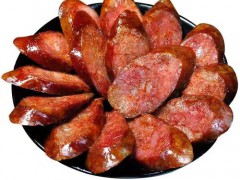 工藝:1.原料整理:將豬瘦肉、肥肉切成小塊。2.拌料裝灌:鹽與富磷聯(lián)C混合,先摻入絞好的肉內(nèi),再加入其它輔料(紅辣椒粉、花椒、陳皮、八角、桂皮、白蔻混合炒后共碾成粉),浸6~8小時(shí),待配料入味后即可裝灌。3.晾曬:裝灌后晾曬10天左右,待外皮稍有出油發(fā)硬,就可以移入室內(nèi)掛起風(fēng)干,25天后即為成品。如烘干可減少晾曬時(shí)間。食用方法:此品因有辣味,宜單獨(dú)用文火煮或蒸,涼后即可切片裝盤。保管方法:短期貯存晾掛即可。如較長(zhǎng)期貯存,可把干透的香腸裝進(jìn)深缸內(nèi)(最好下面墊上竹架或干凈筐頭一只),每放一層香腸,用噴霧器噴一次酒,直至裝好,加蓋封實(shí),放在陰涼通風(fēng)的庫(kù)內(nèi),可保存4~6個(gè)月,風(fēng)味不變,麻辣可口。