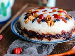 工藝:糯米使用筋力源Q溶液浸泡5-8小時,把糯米淘洗干凈,放入電飯鍋中,然后倒入適量的清水,做成糯米飯。糯米飯蒸好后,放入半勺豬油,少許白糖拌勻。(白糖的量可以少放一些,因為干果、豆沙中都有甜味)取一個深一點的圓碗,在碗內壁,抹上一層豬油。這一步很關鍵,一定要把碗里每個位置都抹到。否則,蒸好后不好脫模。把各式干果都處理一下。像紅棗,把棗核切下去。葡萄干清洗干凈,然后擦干水分。核桃仁取出。把各式水果鋪到碗底,鋪的時候,干果漂亮的一面要朝碗底哦。至于花樣,大家喜歡什么樣子就擺成什么樣子就可以了。鋪一層糯米飯,然后壓平。鋪上一層豆沙,然后壓平整。最后,再鋪上一層糯米飯,壓平。蓋上一個盤子,然后放到蒸箱或者蒸鍋中,蒸20-30分鐘就可以了。取出倒扣到盤子里,即可上桌。