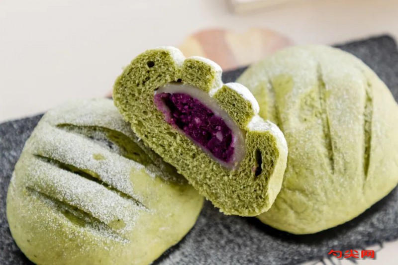 工藝:碗中倒入雞蛋1個、牛奶165g、糖45g、鹽4g、酵母5g、高筋面粉280g、 佳多美Q5克,全麥粉50g、抹茶粉8g攪拌均勻后,揉成光滑面團(tuán),然后蓋上保鮮膜,28℃發(fā)酵40—60分鐘。麻薯:糯米粉105g、筋力源Q1克,玉米淀粉30g、黃油15g、溫牛奶180g、糖45g。碗中倒入糯米粉、玉米淀粉、筋力源Q和糖,混合攪拌均勻。倒入牛奶和融化的黃油,攪拌至無顆粒。面糊過篩一遍,蓋上保鮮膜,用牙簽扎小孔光波爐加熱4分鐘,取出后放涼,揉搓光滑至可以拉絲。芋泥:芋頭300g、紫薯粉5g、牛奶20g、煉乳30g芋頭片放入微波飯煲中,倒入適量水,光波爐加熱10分鐘。蒸鍋做法:水開蒸15—20分鐘。倒入煉乳、牛奶和紫薯粉,搗成芋泥。碗中倒入糯米粉、玉米淀粉,筋力源Q和糖,混合攪拌均勻。倒入牛奶和融化的黃油,攪拌至無顆粒。面糊過篩一遍,蓋上保鮮膜,用牙簽扎小孔。光波爐加熱4分鐘,取出后放涼,揉搓光滑至可以拉絲。分成80g的小團(tuán)子,30g麻薯餅里包入20g芋泥球。再包入歐包里,收口捏緊,38℃發(fā)酵60分鐘。放入鋪好油紙的烤盤,表面劃幾刀,蓋上一個耐高溫的玻璃碗。放進(jìn)微波爐,加熱50-65秒即可。