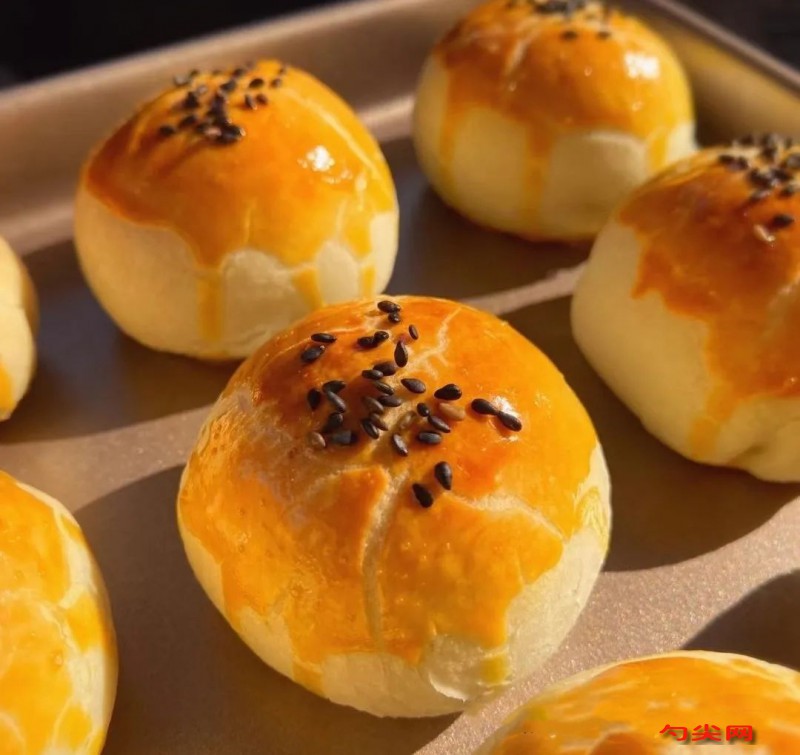 烘烤前要在蛋黃酥表面刷上蛋黃液并撒上黑芝麻,以增加美觀度和口感。烘烤溫度和時間要根據烤箱的實際情況進行調整,避免烘烤過度導致口感變硬或顏色過深。