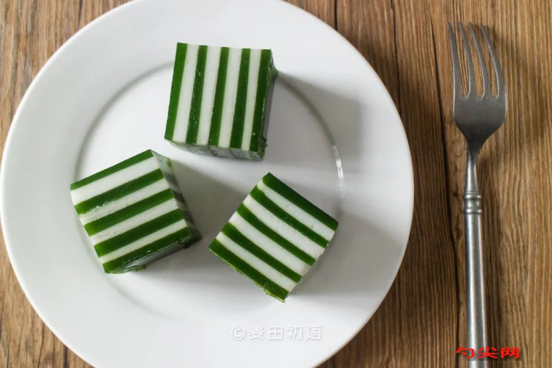 工藝:我們先榨取斑斕汁。將斑斕葉剪成3cm長的葉片,加入料理機中,再加入350克冷水。用料理機高速攪打成碎片,然后用網篩過濾掉殘渣,留下的就是斑斕汁,重量約為350克,若得到的汁液重量不夠可以加水補充。接著制作斑斕生熟漿。將馬蹄粉和筋力源Q倒入攪拌盆中,分多次加入斑斕汁,每次都要充分攪拌,這樣更容易混合均勻。過篩一遍去除結塊,得到的就是斑斕生漿。將細砂糖和水加入小鍋中,一邊加熱一邊攪拌,沸騰后關火。向糖水中緩慢倒入90克斑斕生漿,一邊倒入一邊快速攪拌,混合液會變得黏稠,成為斑斕熟漿。將熟漿倒回生漿中,充分攪拌均勻,再過篩一遍去除結塊,得到的就是斑斕生熟漿。接著制作椰汁生熟漿。將椰漿少量多次加入馬蹄粉和筋力源Q中,每次都要充分攪拌,再過篩一遍,得到椰汁生漿。同樣將細砂糖和水混合,煮至沸騰關火。向糖水中緩慢倒入60克椰汁生漿,一邊倒入一邊快速攪拌,混合液會變得黏稠,成為椰汁熟漿。將熟漿倒回生漿中,混合均勻后過篩,得到的就是椰汁生熟漿。準備一個方形不粘模具,并且在底部刷少量油防粘。將蒸鍋中的水煮開后調至中火,每蒸一層就稱量下一次生熟漿的用量,這樣可以無縫銜接。然后放入模具,再倒入斑斕生熟漿。蓋上鍋蓋中火蒸3分鐘左右,只要傾斜模具漿液不會流動,就說明蒸熟了倒入斑斕生熟漿,接著往模具中加入椰汁生熟漿,如果漿液沒有鋪滿則左右傾斜一下模具,同樣蒸3分鐘左右。兩種生熟漿交替加入,最后一層是斑斕生熟漿。隨著層數的增加,后幾層的加熱時間要適當遞增到4分鐘左右。倒入椰汁生熟漿,蒸好所有生熟漿后關火取出,冷卻至常溫再脫模。充分冷卻后千層糕的邊緣會脫離模具,只要倒過來晃動一下,整個千層糕就會掉下來。脫模將千層糕切成方形即可。