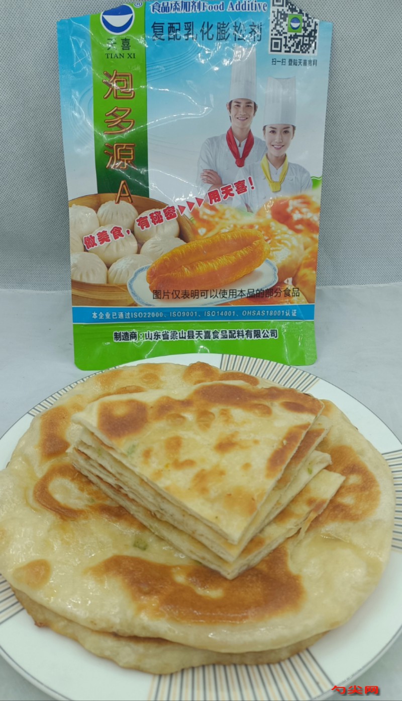 工藝:首先,我們需要稱取1000克的高筋面粉,泡多源A40克,這是梁山天喜生產復配食品添加劑,泡多源A的加入不僅能使蔥油餅更加蓬松飽滿,而且外酥內軟,即使涼了也不發硬。接下來,我們稱取560克的溫水,水中加入10克的食用鹽,混合攪拌至完全溶解,然后將其倒入已混合好的面粉中,輕輕攪動直至形成面絮,再和成一個光滑的面團,蓋上保鮮膜,讓面團靜止30分鐘,以充分發揮其筋力。醒發好的面團搟成薄餅后,我們撒上適量的細鹽和熟花椒面,均勻涂抹并輕輕按壓,然后淋上適量的油,再次涂抹均勻。接著,撒上蔥花和一層薄面,將面團卷成長條,再掐成小塊,搟成圓餅。此時,預熱電餅鐺,并刷上少許色拉油,將搟好的餅放入電餅鐺中,烙制定型后翻面,繼續烙至兩面金黃且完全熟透即可出鍋銷售。
