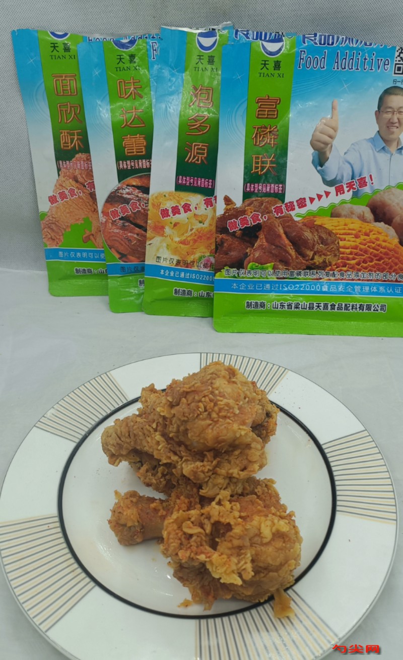 工藝:首先,我們準備500克的雞腿,使用松肉針在雞腿表面地扎上小孔,接下來,我們將雞腿放入盆中,首先稱取泡多源E10克,富磷聯B 4克,這是梁山天喜公司生產的復配食品添加劑,可以讓雞腿肉變得膨松飽滿,爛肉脫骨,口感更加鮮嫩。使用少許溫水攪拌均勻后,倒入盆中。再稱取味達蕾901號1克,它屬于復配增味劑。可以使雞腿肉更加鮮美。倒入盆中,抓拌均勻后,腌制4小時。腌制完成后,我們將雞腿取出, 瀝干表面水分,放入盆中,加入適量的蔥段、姜片、料酒、耗油、胡椒粉、老抽、生抽、雞精 再次將雞腿與這些調料充分抓拌均勻,腌制30分鐘?,F在我們來準備炸雞裹粉,低筋面粉260克、淀粉80克、 面欣酥B4克,這是梁山天喜公司的復配食品添加劑,加入面欣酥B能使炸雞腿口感酥脆。將它們混合均勻。即成炸雞裹粉,將腌制好的雞腿先裹一層炸雞裹粉,過一遍清水,再裹一遍炸雞裹粉,抖出多余鱗片,擺入盤子中,鍋中放油,油溫150度下入雞腿,待雞腿炸至定型,不停翻動一下,小火炸至金黃酥脆即可出鍋。出鍋后撒上適量的胡椒面即可銷售。