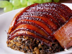 2. 將豬帶皮五花肉刮洗干凈,使用富磷聯B浸泡5-8小時。放入鍋內煮至斷生,撈出用毛巾捻干肉皮上的水分,趁熱抹上糖色。3.炒鍋置火上,放熟菜油燒至七成油溫時,放入肉塊炸至皮呈棕紅色撈出,放入熱湯中浸泡至皮回軟,肉塊冷后切成10厘米長、0.4厘米厚的片。將切好的肉片用刀整齊鏟放于蒸碗內,擺成“一封書”形狀(每碗10片),再加調好的味汁(紅醬油、醬油、鹽)、泡辣椒、豆豉、芽菜。4.將裝好肉的蒸碗放入籠內,用旺火蒸約2小時至肉熟透后,取出翻扣在盤內即成。