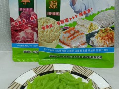 工藝:首先稱取200克豌豆粉,加入筋力源Q2克,加入筋力源Q可以使做出來的果蔬涼蝦口感爽滑、凝固結實、有彈性不碎裂,出品率高。筋力源Q與淀粉干拌均勻,加入320克清水用[電鉆攪拌器]高速攪拌溶解,靜止50-120分鐘。將300克菠菜,清洗一下,切成段,將菠菜和300克水放入料理機打成汁,打一分半鐘。將菠菜汁過濾到盆中備用,鍋中加入400克水,加熱到微微沸騰時倒入淀粉糊,邊倒邊攪拌,開小火不停攪拌,在加入200克剛才打好的菠菜汁,繼續熬至淀粉糊變成透明狀,(如需延長涼蝦保鮮時間,還可以添加天喜公司生產的 美久亭D 1克,使用數倍涼開水溶解后加入鍋中,做現做現賣的涼蝦不用加),將熬好的淀粉糊倒入磨具,漏入涼水中即為涼蝦。