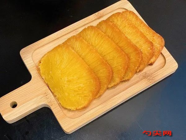 第二階段,下火180℃烤約15-20分鐘。接近時間時,用手推碰烤箱外壁的同時注意觀察蛋糊狀態,上層如有晃動,表示未熟需繼續烘烤,上層無晃動時,則可關掉下火,開啟上火190℃烤8分鐘左右直至表面上色。(8)倒扣晾涼脫模。將黃金糕取出直接倒扣在晾架上完全冷卻后脫模切片。熱時切片會粘刀,而且紋路不夠清晰。