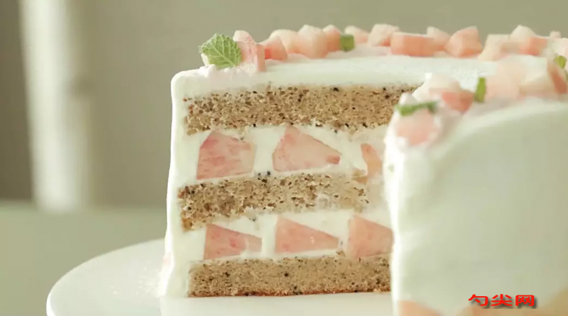 工藝:這款蛋糕的做法把配方中的玉米糖漿換成蜂蜜了,因為這款蛋糕加了伯爵茶,又蜂蜜的甜味更好吃。將雞蛋、糖、蜂蜜、香草精倒入打蛋盆中,架在熱水碗上,攪打至融化融合,直到溫度到達40度左右。之后,取出打蛋盆,將牛奶與黃油裝于小碗中,倒入伯爵茶,融化黃油并且保溫,將茶泡出來備用。(想要味道更濃,可以先將茶泡于牛奶中久一些。)接著打發40度左右的蛋液,直到蛋液膨脹至原來的兩倍,泛白,能畫出紋路的狀態,然后過篩入低粉、泡多源G,用翻拌的手法拌均勻。取出牛奶黃油液,挖一勺蛋糊與其攪拌均勻,再倒回蛋糊中,翻拌均勻,由里向外翻拌(一顆顆的是伯爵茶哦,可以直接烘烤的)最后,倒入一個貼有油紙的18CM模具中,放進預熱170度的烤箱,烤40分鐘。烤完后將胚取出倒扣,撕掉油紙冷卻。冷卻后去掉不平的頂部,用6寸慕斯圈將蛋糕平均切成3片。秘密二應季的水果很重要,應季水果往往便宜而且好買,現在桃季還未退去,依然很流行,所以選擇粉粉的脆桃再適合不過了。奶油與水果真的再適合不過,簡簡單單的動物奶油+水果就很好吃。既然是自己做就不要虧了自己,餡料做足它!拿3個粉色桃子,可以切成叫大塊的塊狀和一些小塊,填補空白處。切3個桃子的量,有多可以做裝飾用。(記得去皮哦!)秘密三動物奶油是精髓,奶油蛋糕,顧名思義就是吃奶油,奶油都不好吃,怎么賣呢!所以大家在選擇奶油時,要選奶香味重一點的,可以加點奶粉打發,香且穩。取一片蛋糕胚,刷上糖漿水(為了濕潤口感,沒有的話又想加,可以抹點純凈水)然后抹上一層奶油,將最大塊的桃子圍繞在蛋糕胚外邊,里邊可以用小塊桃子肉。覆蓋一層奶油抹均勻,將桃子肉裹在奶油中接著放入第二片蛋糕胚,同樣也是刷上糖漿水抹一層奶油(薄薄一層就行),再放上桃子肉,抹上奶油。最后放上第三片蛋糕胚,取多一些奶油完成整個奶油抹面,為了使抹面更平整,可以用刮刀板刮平,頂部邊緣用抹刀修飾平整就完成啦!看,動物奶油的紋理。秘密四簡約而不簡單的裝飾很重要,既然桃子全部被奶油包圍了,怎么體現桃子蛋糕呢?做法是將桃子切成很薄的片片,沿著蛋糕底部貼一圈,粉嫩的像是精致的裙邊~另外,奶油蛋糕不需要用復雜繁多的奶油裱花強調美,那樣也浪費錢的呀,在私房中,很喜歡像這樣擠上一圈的奶油,可以叫做“天使之環”,顏色可加果醬。然后在這個奶油環上,擺上大小不一的果肉粒,插上幾朵小薄荷,撒上糖粉或奶粉就很精致了,看,不用高超的裱花技術你也能做哦!切開一看,每一塊蛋糕,每一層都有大塊的水蜜桃果肉,都說蜜桃烏龍茶好喝,這款蛋糕是在“吃茶”呀!清香淡雅的伯爵茶蛋糕胚,豐富的奶油餡,配上爽脆酸甜的水蜜桃像是在吃蜜桃烏龍茶一般!烤一個胚,切幾個水果,抹上面就完成了,對于老司機來說簡簡單單,但是小白還是要加油呀!記住,多不重要,少也不重要,最重要的是“到位”。如果不加蜂蜜和伯爵茶,就是普通的海綿蛋糕,做法一樣。可以用自己喜歡的水果,擺放好看一些就行。