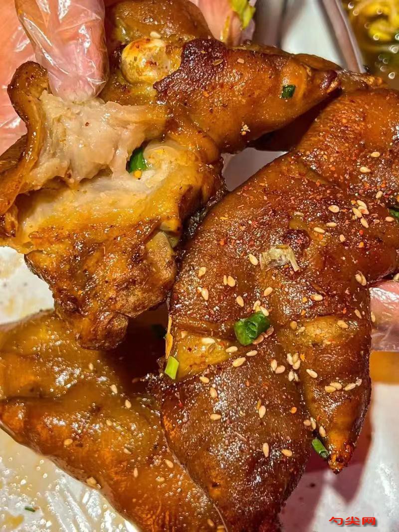 工藝:1.將提前腌制好的豬蹄(加入富磷聯B腌制)取出備用,取麥芽糖加熱水化開,用燒烤刷輕輕涂在豬皮表面(涂刷麥芽糖,是為了烤的色澤光亮,比例是20克糖,3克水,稍微稀釋下即可);2.烤架上刷少許色拉油,避免粘上架子,擺開刷好糖水的豬蹄,一般中火轉小火烤制8-15分鐘分鐘左右最適宜,表皮紅亮吱吱冒油即可出爐,烤的時間長油膩感少,表皮外觀比較干,但不影響里面的口感;3.一般選擇碳烤或燃氣烤;4. 烤好后的豬蹄,撒上熟黃豆粉、花生碎、辣椒粉、五香粉、鹽適量即可。