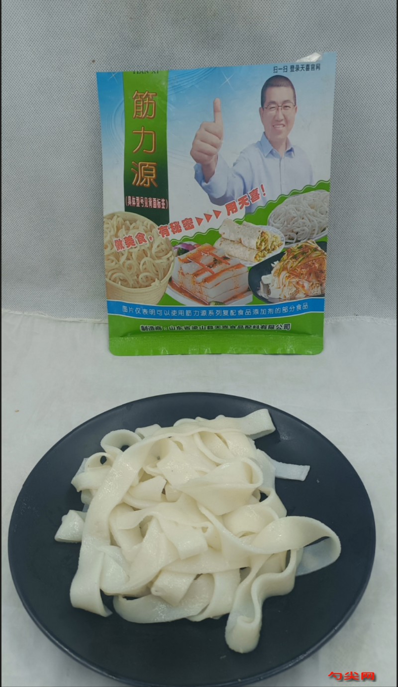 工藝:首先稱取500克桂朝米,先用清水清洗兩遍,然后加水末過米粒浸泡6小時以上,將泡好的米撈出,再加入750克清水放入磨漿機中,進行打漿,打到米漿細膩無顆粒狀態即可。將米漿使用篩網過濾,倒入碗中。再來稱取筋力源D型2克,這是天喜公司生產的復配食品添加劑,加入筋力源D可以使米皮筋道爽滑,而且不易斷裂。使用少許溫水溶解后倒入米漿中,攪拌溶解,接著加入小麥淀粉50克,邊倒邊打攪, 打攪均勻后,蓋上保鮮膜靜止1個小時即可。鍋中水燒開,將磨具擦點油,放入鍋中預熱,取出磨具倒入適量米漿,攤平,上邊如果有氣泡可以用手點一下,然后鍋中水再次燒開放入磨具,蓋上鍋蓋,大火蒸3-5分鐘,米皮鼓大泡就可以取出磨具,放入涼水中,上邊刷上一層熟油防粘,然后揭下來就可以了,脫膜,然后切條。采用自然降溫或空調降溫,徹底涼透后密封包裝,放入冷柜或空調室內低溫10-15℃冷藏或銷售。
