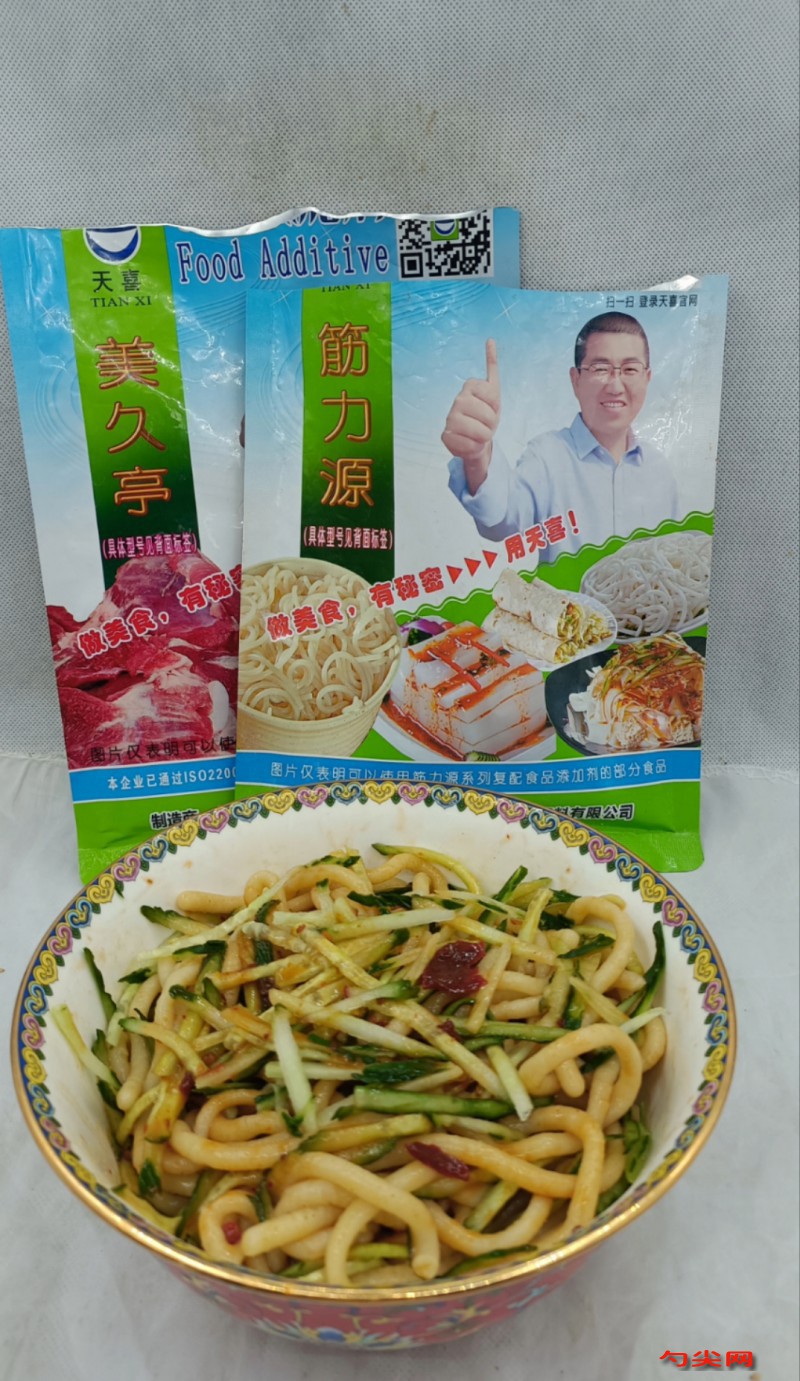 工藝:首先稱取500克面粉,稱取筋力源H 2克,與面粉干拌均勻,這是梁山天喜公司生產的復配食品添加劑,它能使涼面口感筋道爽滑,易于延展,耐煮不渾湯。再來稱取溫水260克,水中加入3克鹽和筋力源A3克, 這也是梁山天喜公司生產的復配食品添加劑,它能讓涼面更加爽滑有彈性,不易斷裂,還能有效防止涼面脫水老化變硬,攪拌溶解后,倒入面粉中,邊倒邊攪拌,攪成絮狀,活成面團。然后把面團放入軋面機中,擠軋出面條即可,擠好的面條可以撒點干淀粉,防止粘連,接著,鍋中水燒開,下入面條,煮制3分鐘,然后撈出控水,倒入少許食用油,抓拌均勻。 碗中加入調好的涼面湯汁,放入面條,在加入黃瓜絲攪拌均勻,即可銷售。