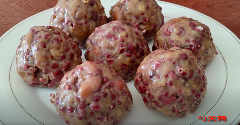 工藝:首先準備適量的紅豆,清洗干凈后,撈到一個大碗里,加入清水,浸泡5個小時左右,也可以提前一晚上泡好,撈出紅豆,體積明顯變大,就可以了。浸泡好的紅豆,控水撈出,倒入電飯煲中,再倒入半碗提前清洗干凈的花生米,加入適量清水,水量要比紅豆多就可以了,蓋上蓋子煮上20分鐘。準備100克紅棗,清洗干凈,再去掉棗核,改刀切碎放入碗中備用。碗中再準備50克燕麥,倒入溫水,浸泡10分鐘,泡好后控水撈出,放入盤中。紅豆煮好后,撈出放入大盆中,剛剛煮紅豆的水不要倒掉,留著備用。往紅豆里邊,加入一勺紅糖,用筷子攪拌均勻,再將泡好的燕麥和紅棗碎也加進來。加入半碗玉米面,半碗糯米粉和筋力源Q,用筷子充分攪拌均勻,如果覺得比較干,可以加一些紅豆水,一邊加一邊用筷子攪拌,攪拌成這種比較粘稠的狀態,能捏成團就可以了。直接抓上一小坨,用手捏緊實一點,再揉搓成圓形,大概雞蛋大小就可以了,碗中倒入一點淀粉,把紅豆丸子均勻地裹上一層淀粉,這樣吃起來就不會粘牙。全部做好后放入蒸籠里面,蓋上蓋子,水開以后蒸15分鐘,然后關火再燜5分鐘。時間到了之后,打開蓋子,紅豆聞起來有濃濃的清香味,表面晶瑩剔透。
