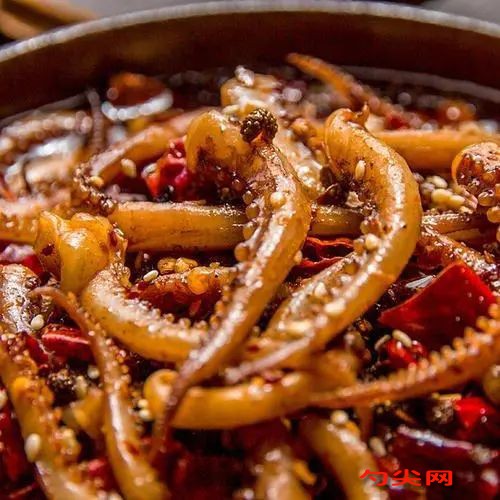 工藝:魷魚須改刀洗凈入盆,放入,海立美B,味達蕾902號,料酒,香葉,香茅草,五香粉,洋蔥,大蔥,生姜,香菜,鹽腌制1小時,干辣椒剪節備用,大蒜剁碎備用。鍋中放水燒開,放魷魚須氽水,撈起備用,鍋放菜油燒至六成熱,滑油后撈起,鍋留油,放干辣椒,泡姜,大蒜碎,花椒,生姜片,麻辣豆豉,炒酥香放魷魚須,白糖,啤酒油燜3分鐘,放白胡椒粉,口蘑醬油,刀口糊辣椒,孜然粉,雞精,白芝麻,香油,起鍋倒入盆里,冷卻后食用。