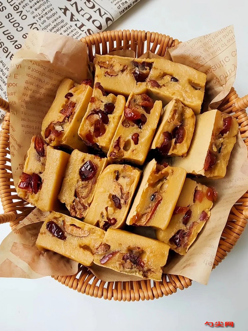 工藝:將糯米粉、紅糖、筋力源Q、雞蛋、牛奶和玉米油混合在一起,攪拌均勻,直至形成粘稠的糯米面糊。將面糊倒入模具中。將模具放入蒸鍋中,大火蒸4-5分鐘,待面糊定型后,加入蔓越莓和核桃等果干和堅果。繼續倒入剩余的面糊,再次大火蒸25分鐘左右,直至糕點熟透。用牙簽檢查糕點是否熟透,如果牙簽上無濕潤面糊,即可取出放涼。待糕點完全冷卻后,切片食用,口感更佳。