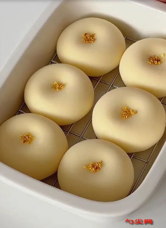 工藝:在鍋中將適量的糯米粉,筋力源Q,水混合,用小火慢慢加熱,邊加熱邊攪拌,直到面糊變成絮狀。加入20g黃油,繼續(xù)翻炒直到面糊抱團(tuán)并且不粘于刮刀。將面糊移出鍋,稍微冷卻后在案板上撒上熟粉(防粘),反復(fù)拉扯直到面團(tuán)變得順滑。將面團(tuán)均勻分成8份,每份搟成圓片,放置在模具中。在模具中的糯米皮上先放一層奶酪,然后加一層桂花酒釀,最后再蓋上一層奶酪。將糯米皮的邊緣向中心包裹好,確保餡料不外漏。用剪刀剪掉多余的部分,確保成型整齊,再次撒上熟粉防粘。用指腹在糕點(diǎn)中心輕輕按下形成小窩,這樣可以在視覺上更有層次感。在每個(gè)糕點(diǎn)上撒上少許桂花作為裝飾。