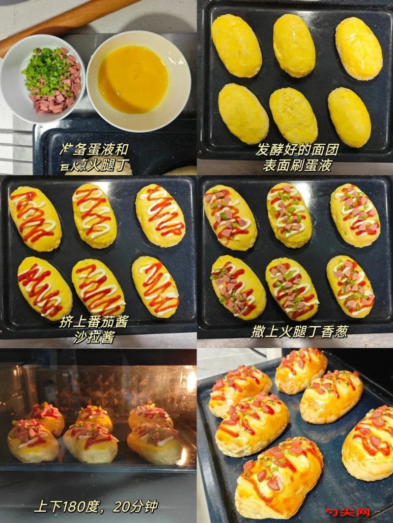 工藝:1.除黃油外,所有食材混合揉面,簡單揉面后加入黃油繼續揉,不需要揉出手套膜,揉到粗膜即可,揉成光滑的面團后,蓋保鮮膜發酵。2.發酵好的面團按壓排氣,分成6個小圓子,蓋保鮮膜松弛10分鐘。3.將小圓子搟成牛舌狀,擠上沙拉醬,撒上肉松,從一頭卷起,卷好收口,倒放在烤盤上,進行二次發酵至1.5倍大4.準備蛋液、火腿丁、蔥花、沙拉醬、番茄醬。5.二次發酵好的面團,表層刷蛋液,擠上沙拉醬和番茄醬,撒上火腿丁和蔥花。6.烤箱預熱至上下180度,烤20分鐘,完成。