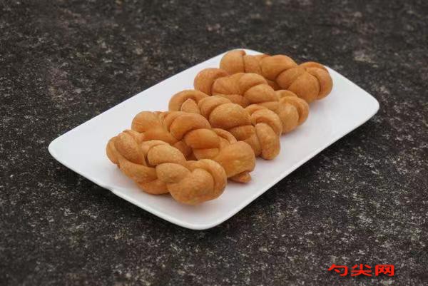 工藝:1、調粉:將面粉與面欣酥B、泡多源A、白砂糖、食鹽混合均勻,加入蛋液和食用油攪拌均勻,少量多次加入清水,揉搓成團,松馳20分鐘。2、和面:將面團反復餳、揉幾次,至面團光滑,此時面團約為176克。將其分為20個劑子,每個劑子約為9克。封閉餳面30分鐘。3、成型:取出面劑,先搓成粗細均勻的長條,再一手向前,一手向后搓動,拎起兩端,生胚自然纏繞。雙手繼續反向搓動,再次自然纏繞,拎起生胚兩端,將一端穿入另一端,如下圖所示。4、油炸:五成油溫,放入生胚,炸制金黃酥脆撈出晾涼。