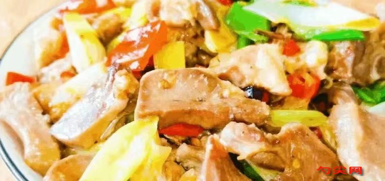 第5步、接著,合入熟豬舌頭翻炒翻炒。