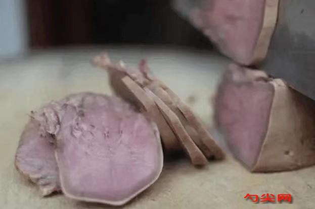 2.豬舌煮熟后,取出,清洗干凈,用冷水浸泡,直至完全冷卻。現(xiàn)在天氣很熱。一種方法是把它浸泡在冰水里,另一種方法是把它放在冰箱里。