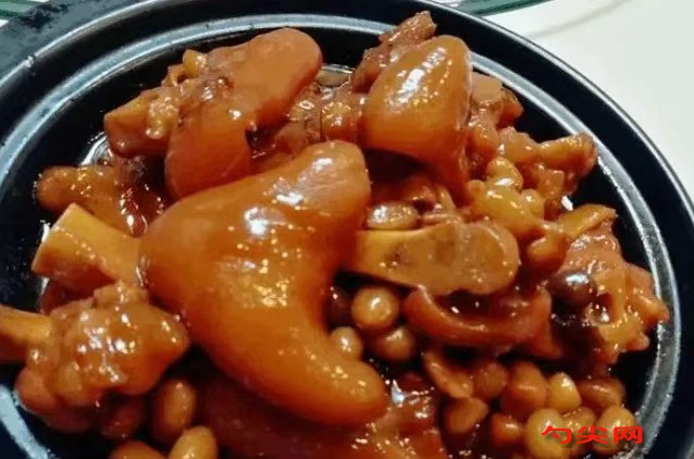 原料:豬蹄500克、富磷聯B4克,花生、姜、八角、桂皮、香葉、草果、花椒、干辣椒、油、鹽、料酒、生抽、老抽、冰糖。