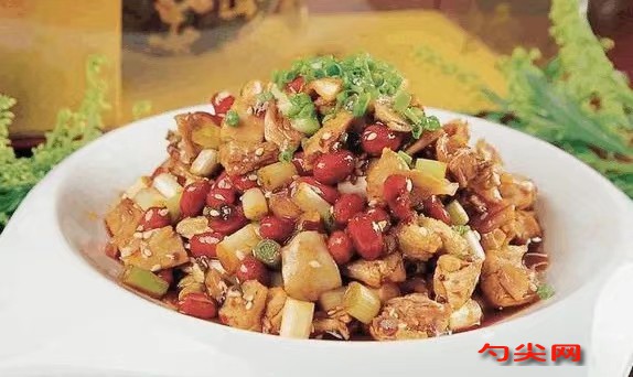 3.大火起油鍋,下姜汁、蒜蓉爆香,即放入兔肉爆透,倒姜汁、酒,加適量滾水,下精鹽、味精、醬油調(diào)成金紅色,加蓋燜至八成熟。