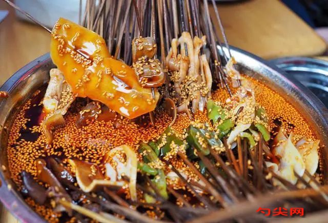 葷菜類除選用雞子外、還可選用郡肝、去骨雞爪、火腿腸、兔腰、鶴鶉蛋、鴨食管、環喉等。素菜可選海帶、豆腐皮、土豆、蓮藕、木耳、竹筍等,以上材料分別改刀成片或直接穿成小串下沸水鍋中煮至斷生撈出入涼開水中冷卻濾干水份,放入麻辣紅湯料中浸泡20分鐘淋上紅油即可出售。