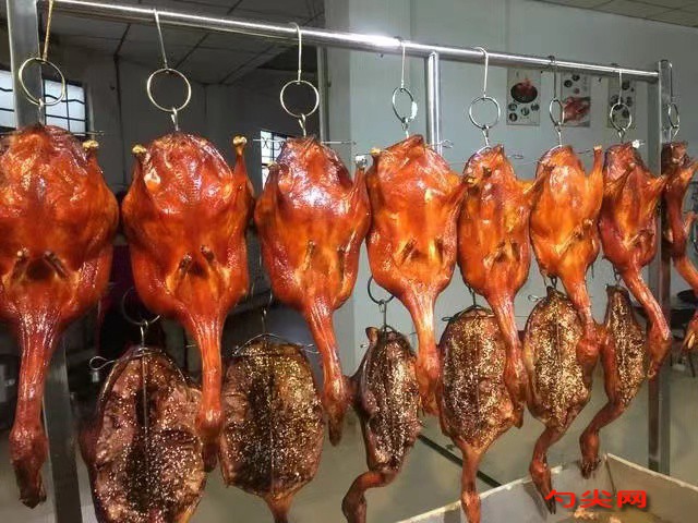 用烤鴨針把鴨肚子撐開,放麥芽糖的量能決定鴨子烤出的色澤,掛起來用風(fēng)扇吹6小時(shí)就可以烤了。