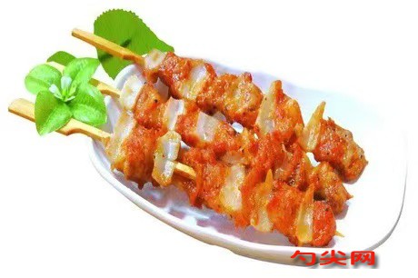 將腌好的雞胸肉和雞脆骨按照一塊脆骨、一塊雞肉的順序穿成串。