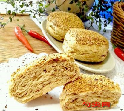工藝;1. 準備300克面粉和5克面欣酥A攪拌均勻。2. 把3克酵母用18O克水化開和面,水要一點點加,各種面粉的吃水性不同,在和的時候如果感覺面粘了,就不要在往里加水了。3. 加好水的面粉成雪花片狀。4. 把面揉成光滑狀醒發40分鐘,和面一定要軟喲,千萬不能硬。5. 桌上撒上干面粉防沾,因為此餅的面非常的軟粘,把面團搟成約O,8厘米厚的規則長方形面皮,不能太薄喲。6. 取半碗芝麻醬用2勺芝麻油一勺鹽調均勻備用。7. 把調好的芝麻醬均勻抹在搟好的長方形面片上,四周不要抹上喲,一會壓實封邊防漏醬汁。然后撒上花椒料。我們開始第一次疊被子。從右邊折過來,在左邊折到右邊上面完全看不到芝麻醬了,兩邊輕壓一下,這時把豎著的面坯橫過來在次搟開成長方形,手法一定要輕,以免芝麻醬漏出,一定別忘下面撒些干面!8. 這是第二次疊被子,從左上角開始為第一步,第二步抹剩余的醬,第三圖右折一下,第四圖左折一下,完成。9. 第三次疊被子,重復上步驟,還是從左上角為第1步,右折一下,左邊折到右邊,把面橫過來搟成長方形,從下往上卷,卷成圈柱形。10. 用刀切成九等份,每一份為一個小劑子,把劑子立起用手捏緊,兩端切面都要捏緊收口,整理成圓形餅坯備用。11. 一勺面二勺水調個面糊,用刷子刷到餅坯上,在把餅坯有面糊一面放到芝麻盤中粘上芝麻,還要壓一下,防芝麻掉粒。