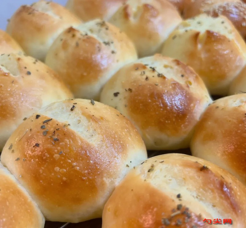 配方:高筋面粉390g,佳多美Q6克,土豆泥155g,奶粉18g,牛奶78g,水120g,白砂糖25g,鮮酵母15g,鹽7g,橄欖油38g,全蛋液適量,歐芹碎適量,黃油30g,28*28烤盤一個,烘焙溫度及時間:180度15分鐘。