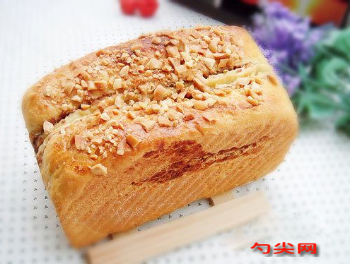 工藝:面包粉、佳多美Q、美久亭Q干拌均勻,酵母用常溫水溶解后加入面粉,再加入雞蛋、糖、黃油。揉至面團完全光滑。放醒發箱或醒發室發酵至2至2.5倍大,發酵好的面團取出排氣,搟成長方形,放入豆沙。將面團三折一次,松弛20分鐘。將面團搟開。面團再三折一次。在中間切一刀。放入土司模。最后發酵至8分滿。表面刷蛋液,撒花生碎。烤箱預熱180度中層35分鐘,上色后加蓋錫紙。